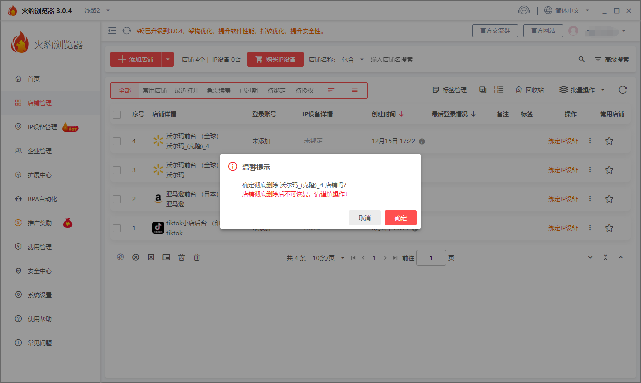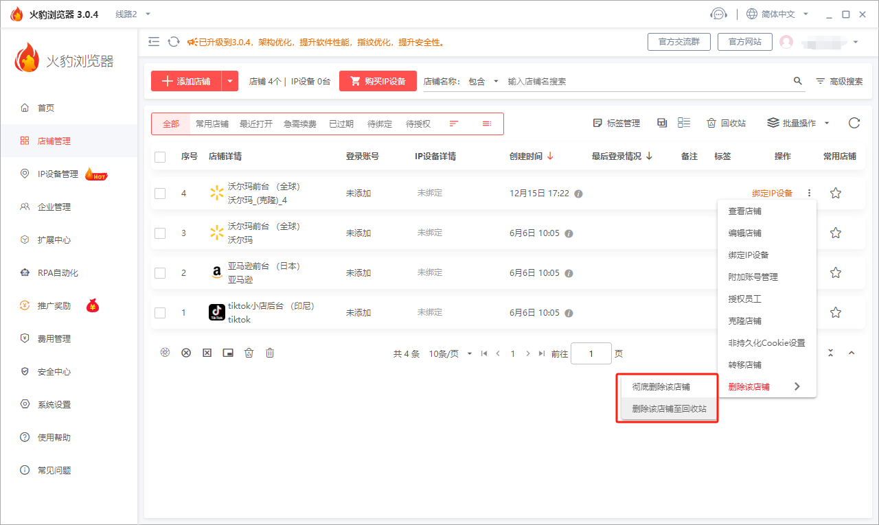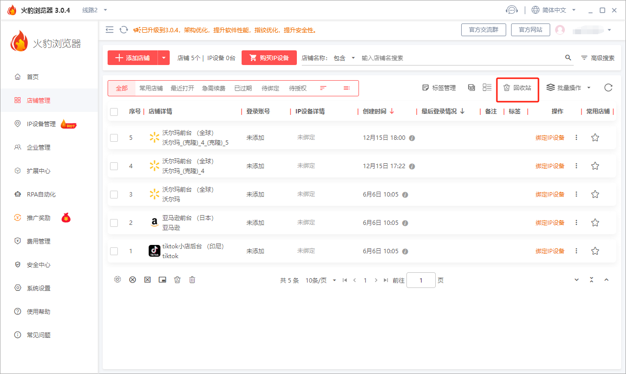 在使用火豹浏览器时如果店铺绑定的IP设备过期是不会自动删除的,但会占用一个位置,由于卖家会在店铺设置主页面同时操作多个店铺,多余的店铺可能会被误删,那么该如何恢复这些被删除的店铺呢?本文火豹浏览器小编,就带大家来了解一下。