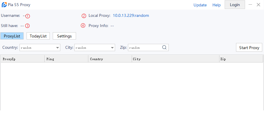 1.打开Pia S5客户端,顶部的信息代表含义为:① 你的用户名 ② 本机IP及端口 ③ 剩余IP数量 ④ 代理信息