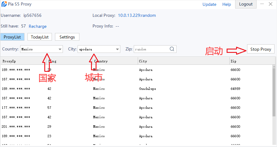 2.过滤国家和城市,点击“启动代理”获取目标国家的IP列表。
