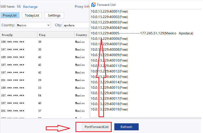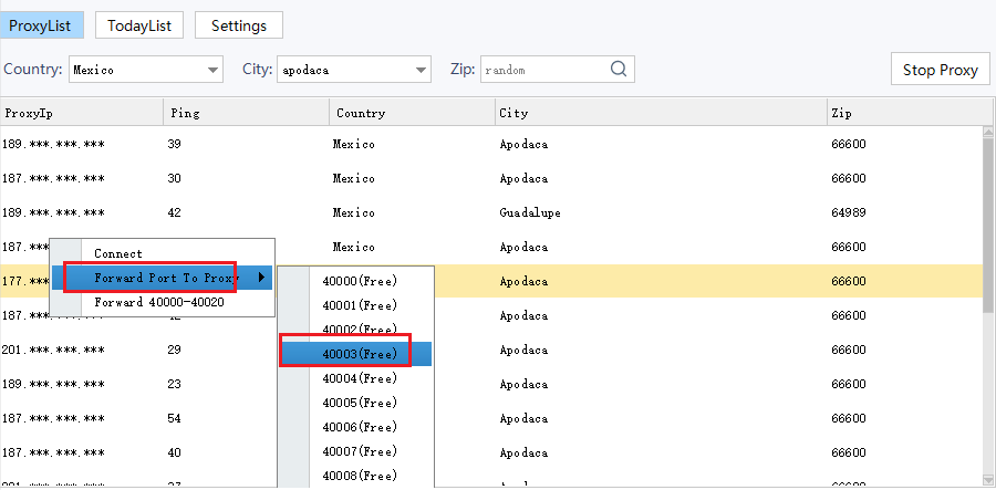 3.右键点击一个IP,点击“Forward Port To Proxy”,选择一个端口。