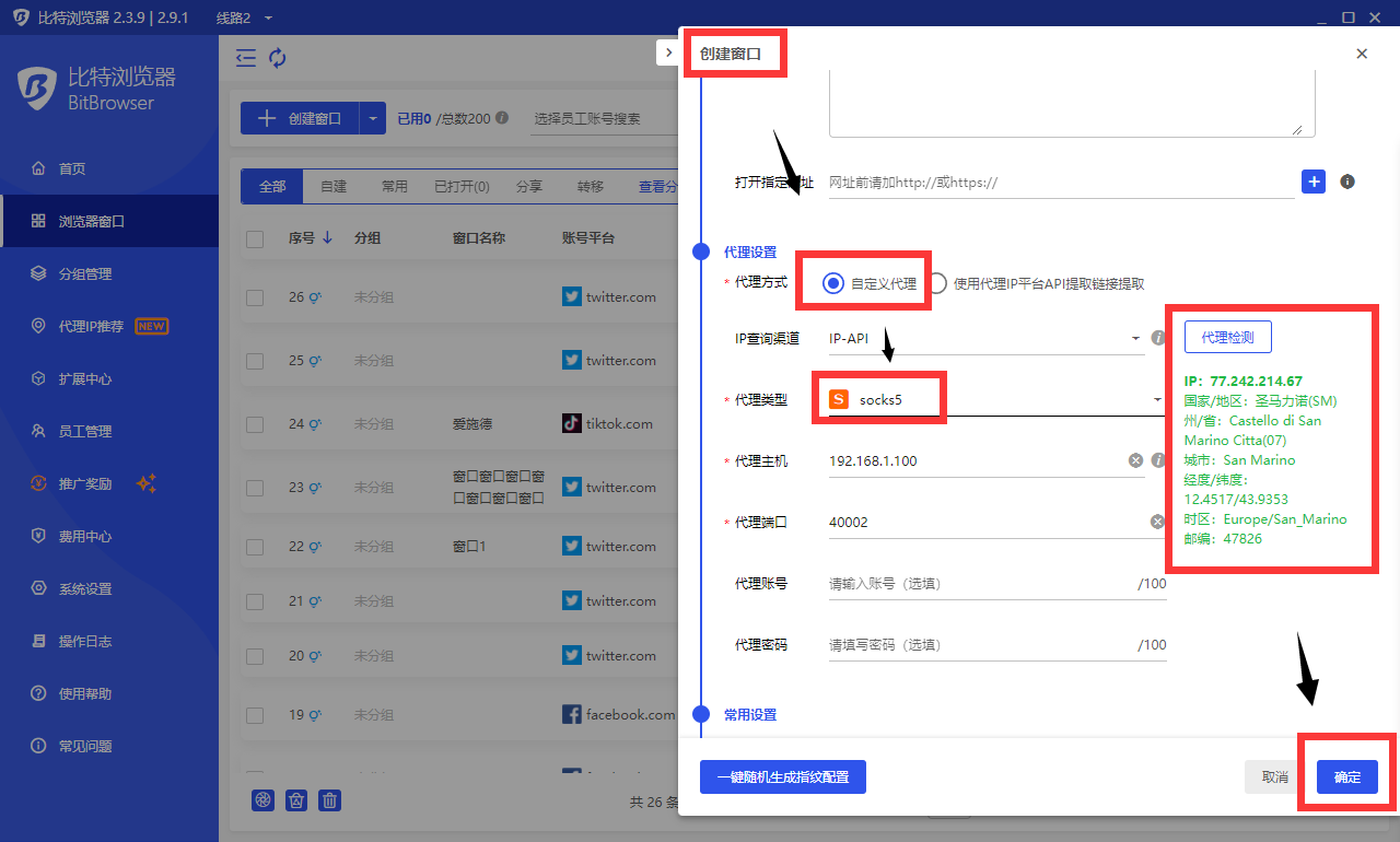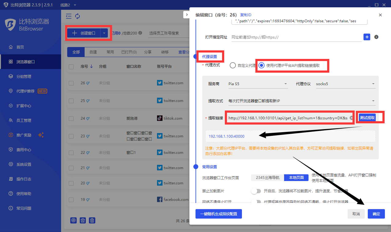 3.打开比特浏览器,创建窗口,“代理设置”选择“使用代理平台API提取链接提取”,“服务商”选择“Pia S5”,代理协议选择“socks5”,在“提取链接”处粘贴刚才Copy的URL,粘贴完成后点击“测试提取”,会显示获取到的“代理信息”,点击“确定”代理设置成功。