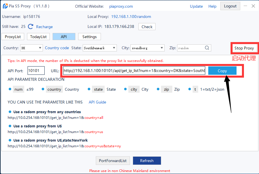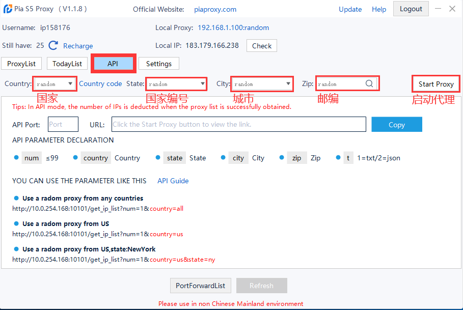 1.进入Pia s5,点击API选项卡,选择指定的“国家”、“国家编号”、“城市”、“邮编”,点击启动代理。
