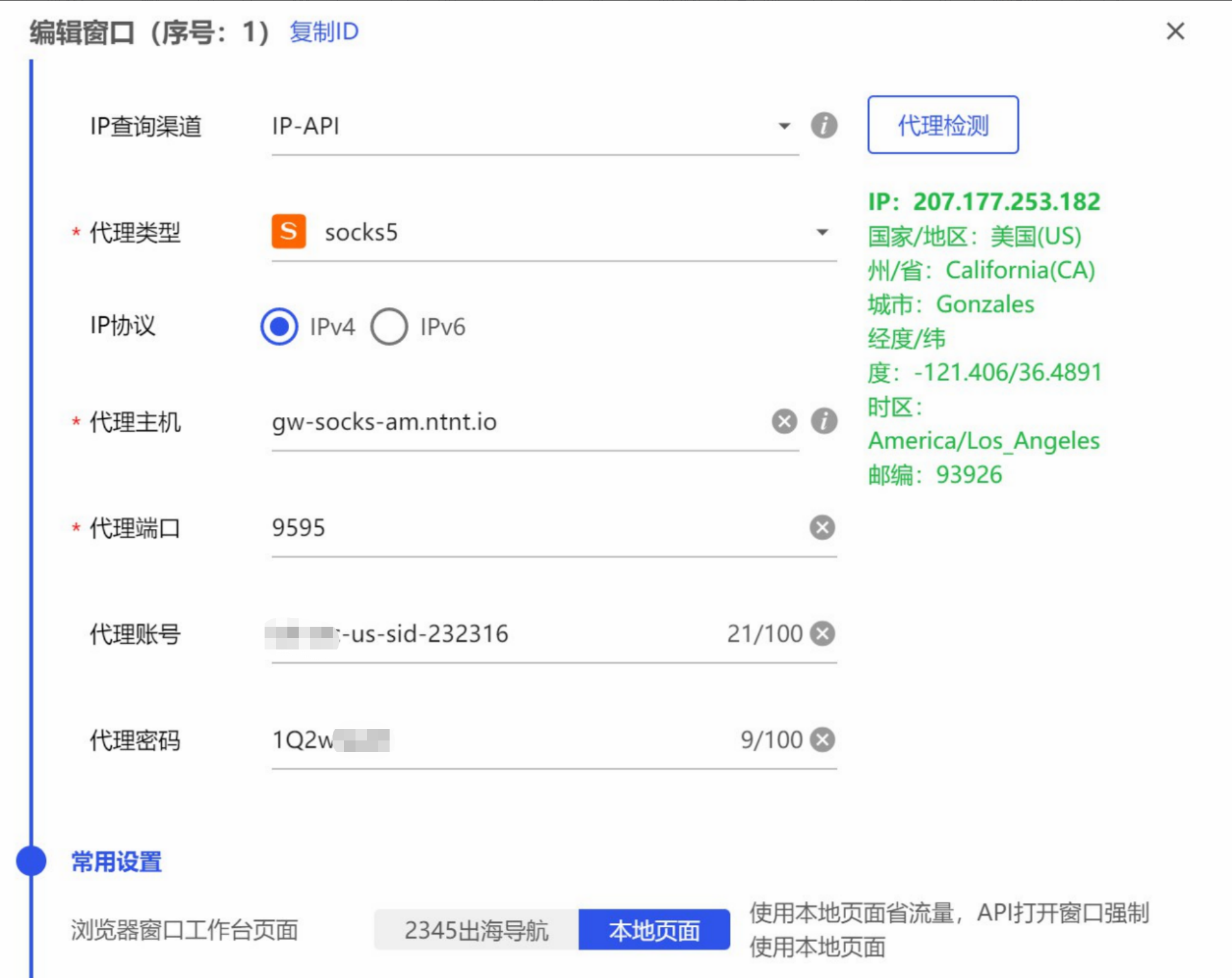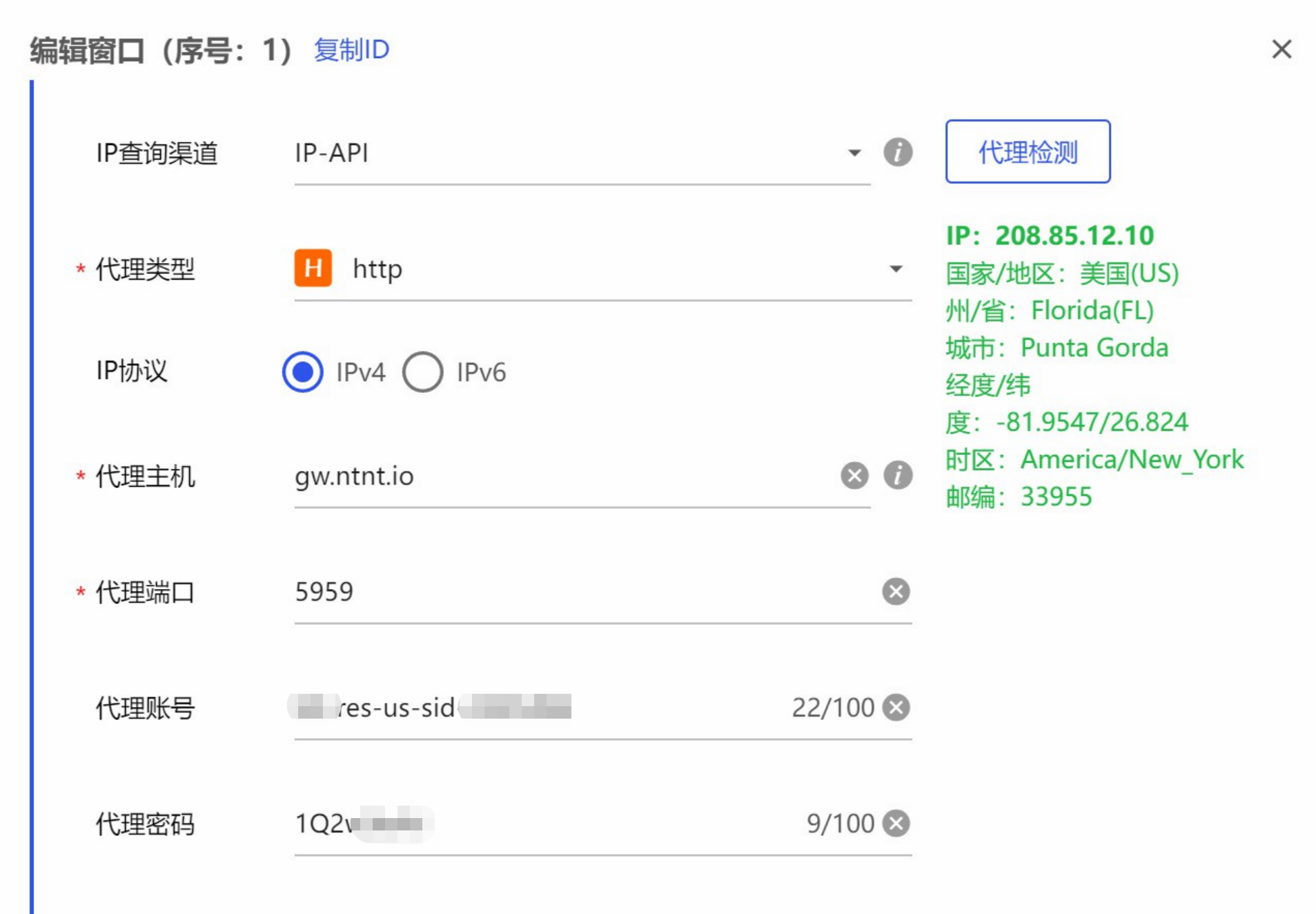 第4步、配置代理。在NetNut中生成代理信息,并粘贴到比特浏览器的代理设置中,然后进行代理检测,检测代理IP的连通性!