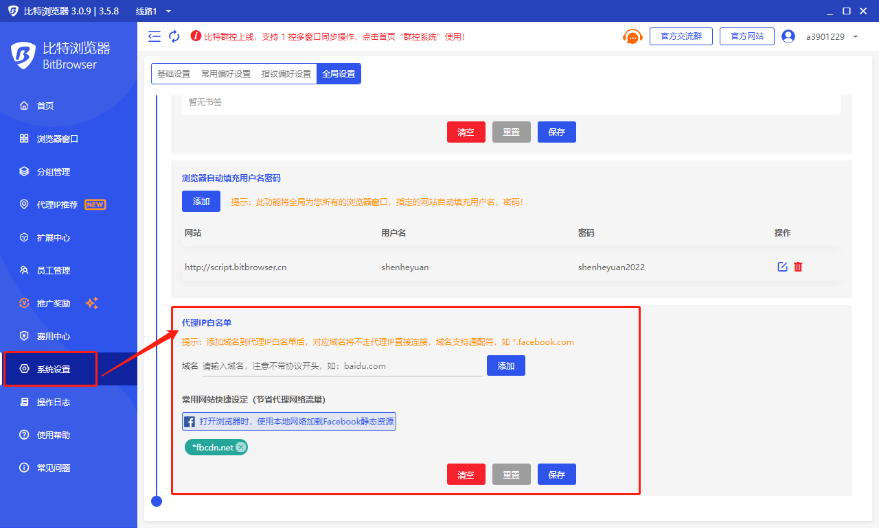 2. 系统设置新增浏览器代理白名单功能,可以针对如 Facebook 静态资源等设置域名白名单,直连不走代理,节省流量