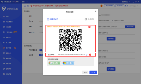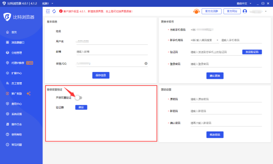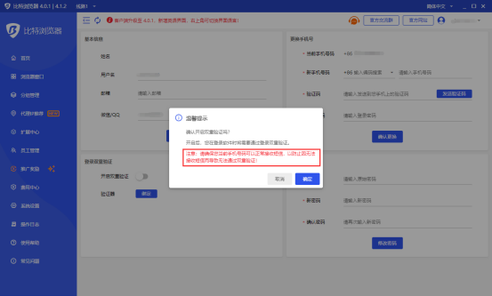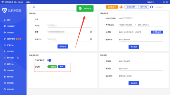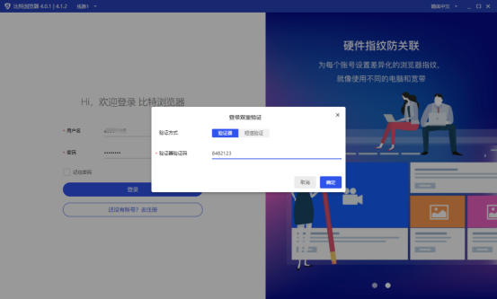 5. 这样一来,我们登录比特浏览器就需要通过输入“验证器验证码”或“短信验证码”的方式进来进行双重验证登录账户。