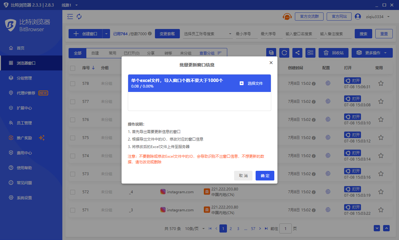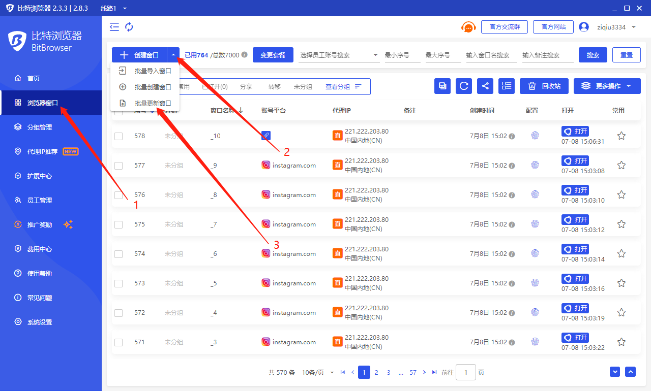 打开客户端 -> 点击左侧菜单“浏览器窗口” -> 点击“创建窗口”按钮右侧的“V”图标 -> 点击“批量更新窗口”